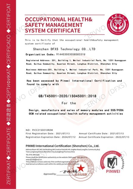 | Phạm vi/phạm vi: | Design, manufacture and sales of memory modules and ssd/pcba oem related occupational health safety management activities |