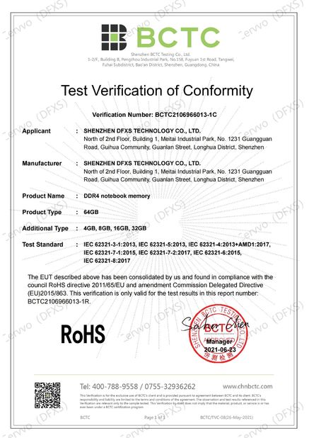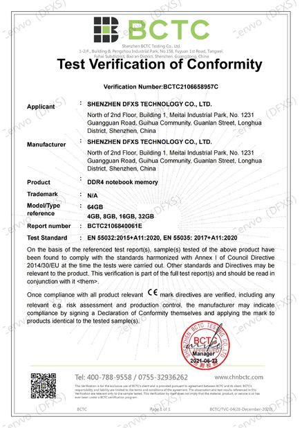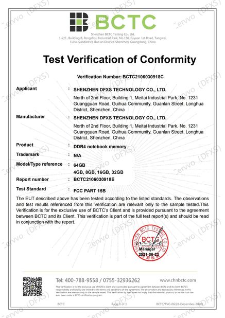 | Tiêu chuẩn: | FCC for DDR4 notebook memory |