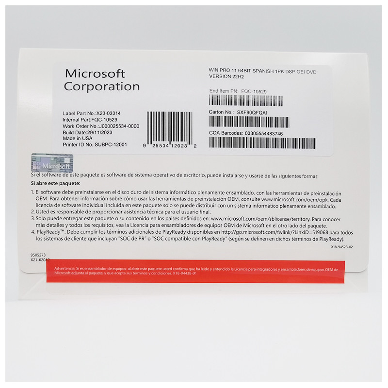 Authentic Windows 11 Pro OEM CD Key gói ngôn ngữ Tây Ban Nha bao gồm